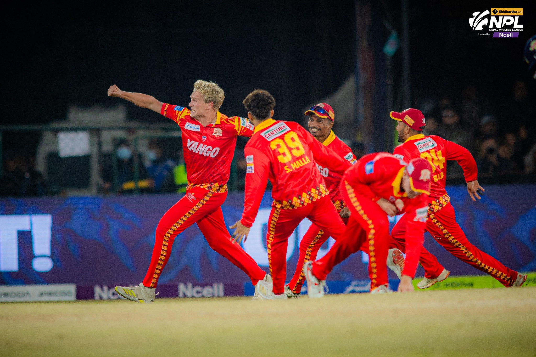 बलिङतर्फ लुम्बिनीका तिलक भण्डारीले ४ ओभरमा १५ रन खर्चेर ३ विकेट लिए । निकै किफायती बलिङ गरेका रुबेन ट्रम्पलम्यानले ३ ओभरमा ९ रन मात्र दिएर २ विकेट हात पारे । अभिशेष गौतम र जेजे स्मिथले पनि २–२ विकेट लिँदा शेर मल्लले १ विकेट आफ्नो नाममा लेखाए ।