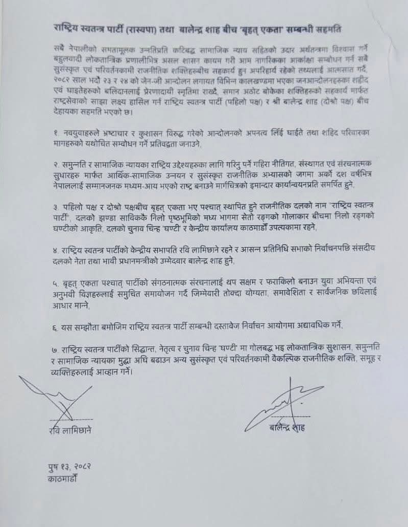 राष्ट्रिय स्वतन्त्र पार्टी (रास्वपा) का सभापति रवि लामिछाने र काठमाडौँ महानगरपालिकाका प्रमुख बालेन्द्र शाह (बालेन)बिच ‘बृहत् राजनीतिक एकता’ कायम गर्ने विषयमा सात बुँदे सहमति भएको छ। दुबै नेताले आइतबार प्रतिनिधिसभा निर्वाचन एउटै दलमार्फत लड्ने घोषणा गर्दै उक्त सहमतिपत्रमा हस्ताक्षर गर्नुभएको हो।